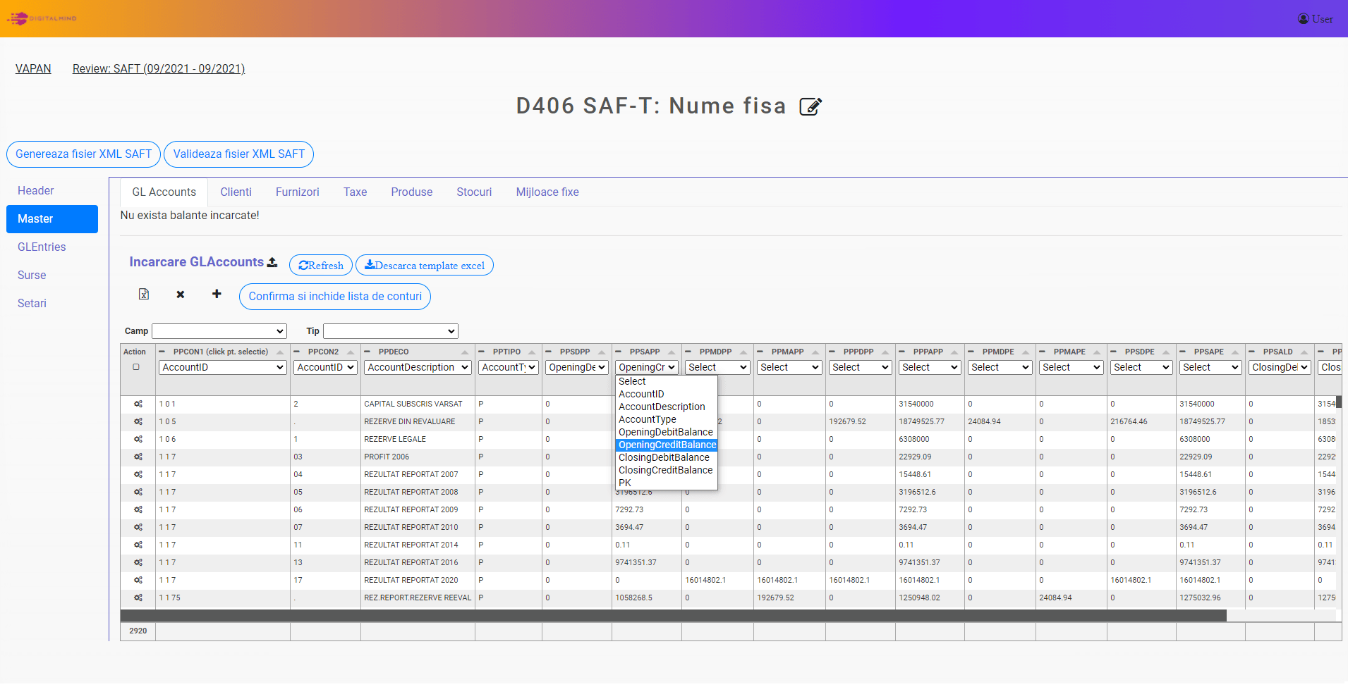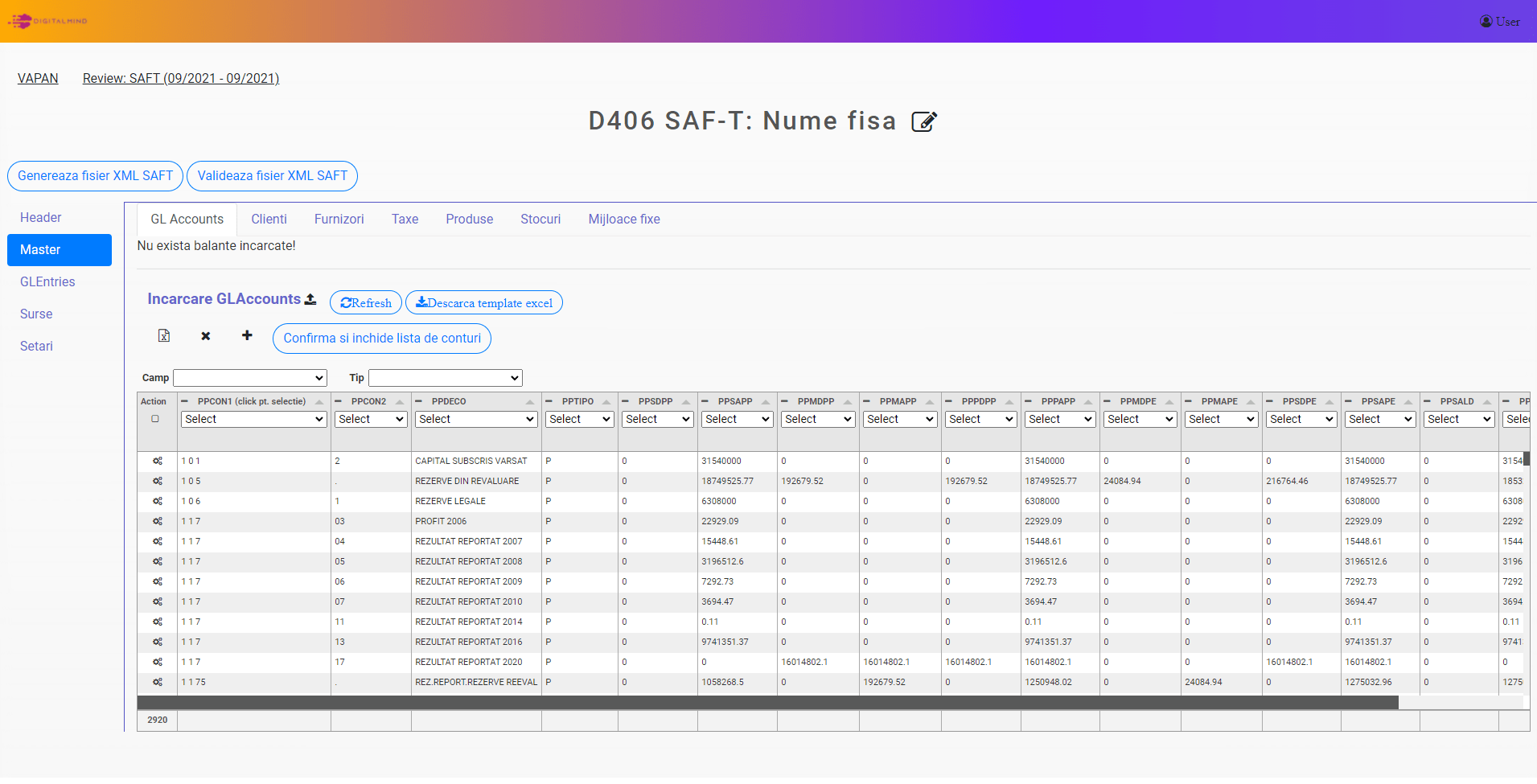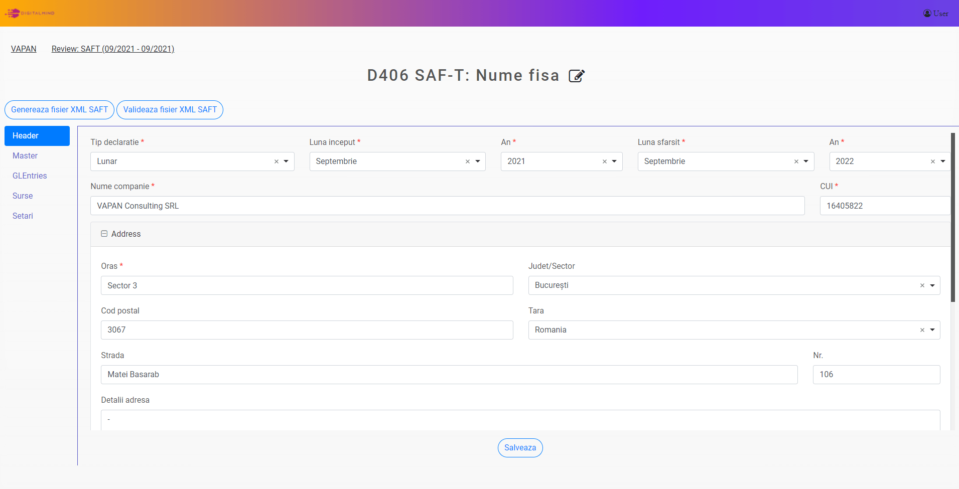 - Generarea fișierului XML în format SAF-T de către sistemul informatic propriu al contribuabilului